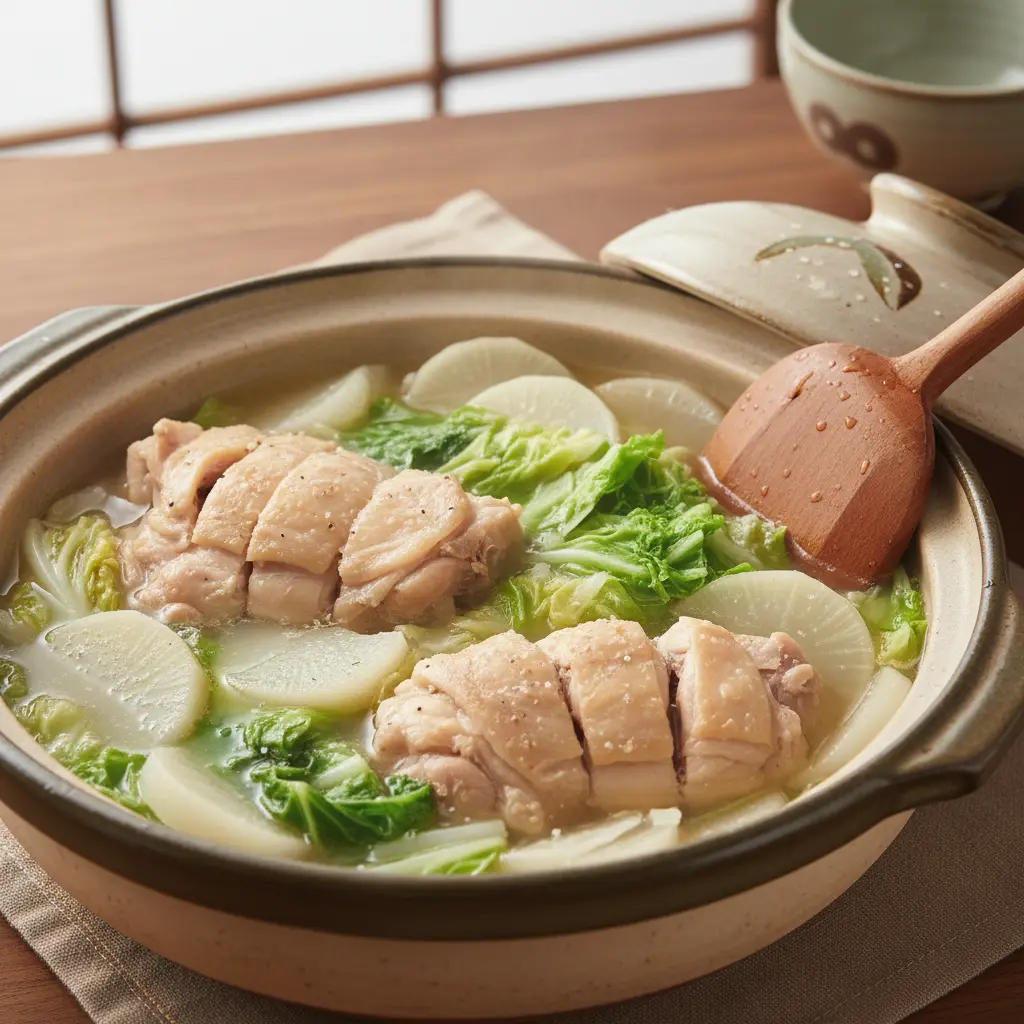 白菜はざく切り、大根はいちょう切りにし、鍋に鶏肉と交互に重ね入れます。水5カップと残りの塩を加え、ふたをして中火にかけ、煮立たせてアクをとります。