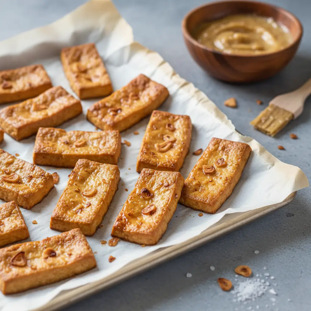 오븐 팬에 종이 호일을 깔고 쌈 두부가 겹치지 않게 배열한 후, 예열된 오븐에서 14분간 굽습니다.