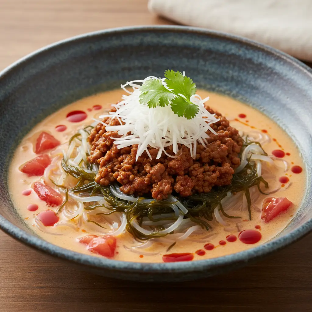 這道冷番茄擔擔麵使用水雲和蒟蒻絲替代傳統麵條,大幅降低碳水化合物含量,非常適合低醣飲食。肉味噌可以一次性多做一些,分裝冷凍,作為便當配菜或搭配其他料理。湯底可以依個人喜好調整酸辣度,喜歡更濃郁的番茄味可以增加番茄用量。