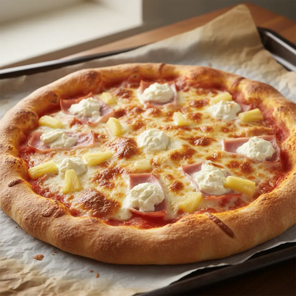 將披薩麵糰從塑膠袋中取出,放在鋪有烘焙紙的砧板上,再蓋上一層烘焙紙。使用擀麵棍將麵糰擀成厚度約5毫米、直徑約25厘米的圓形。將麵糰連同烘焙紙一同移至烤盤上,在麵糰邊緣留下約2厘米的邊,然後塗上披薩醬。將奶油乳酪撕成小塊均勻地鋪上,再鋪上火腿、披薩用乳酪和切塊鳳梨。
