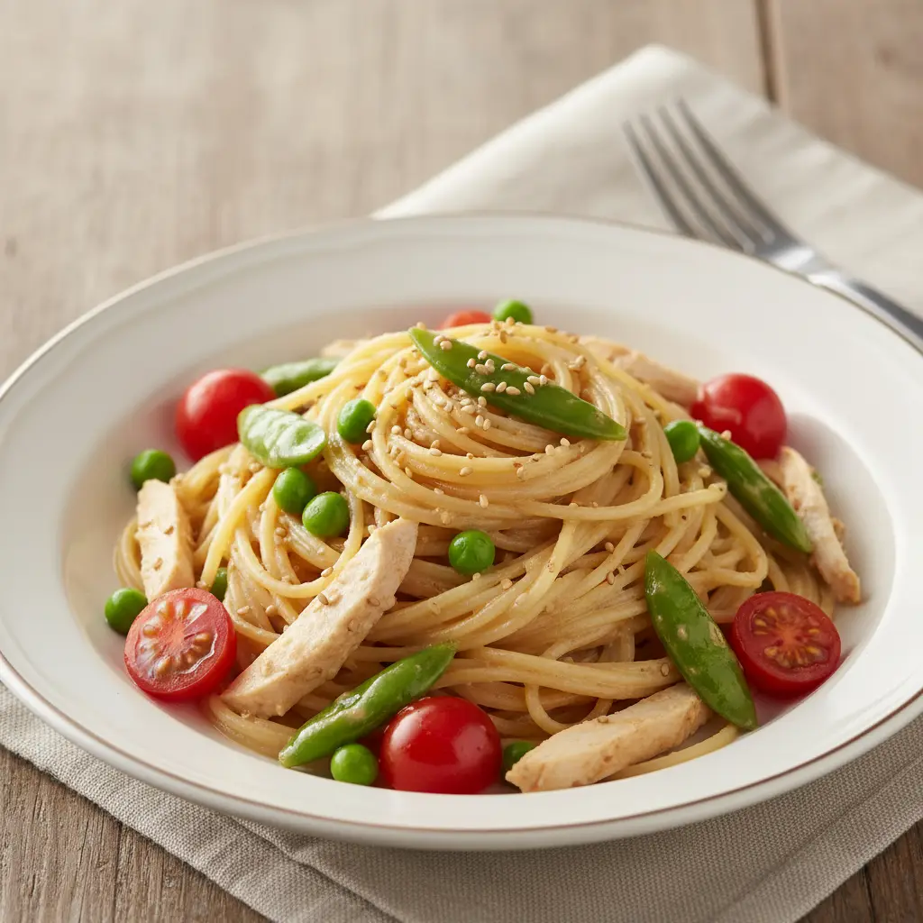 這道冷義大利麵適合在炎熱的天氣享用,清爽開胃。可提前將義大利麵煮好並冷卻,準備醬汁和配料,待食用前混合,節省時間。若無沙拉雞胸肉,可用雞胸肉自行水煮後撕成絲,或使用煙燻鮭魚等其他冷食肉類替代。芝麻醬可根據個人口味調整用量,喜歡濃郁口感可適量增加。
