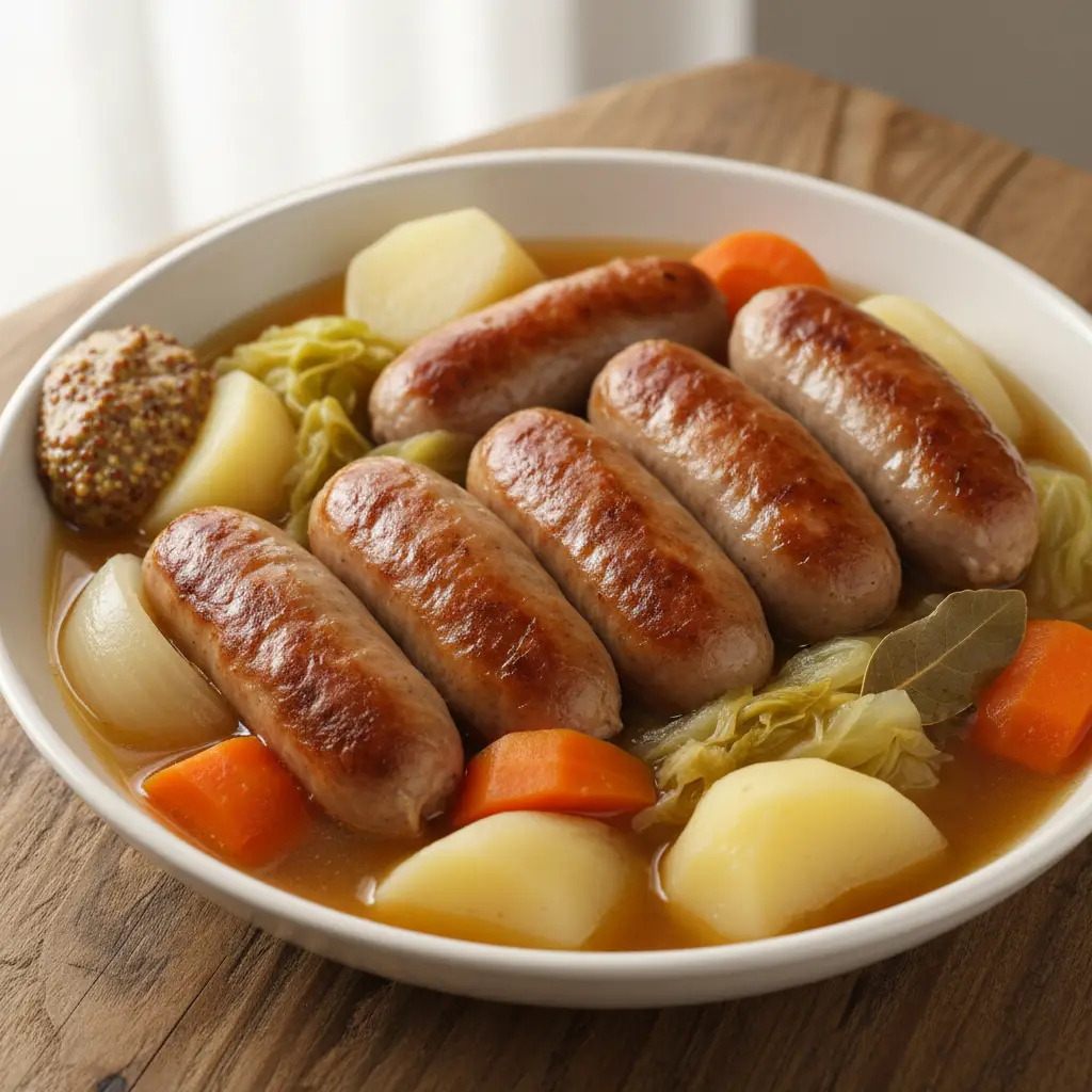 將煮好的香腸蔬菜湯盛入碗中,搭配顆粒芥末醬享用。