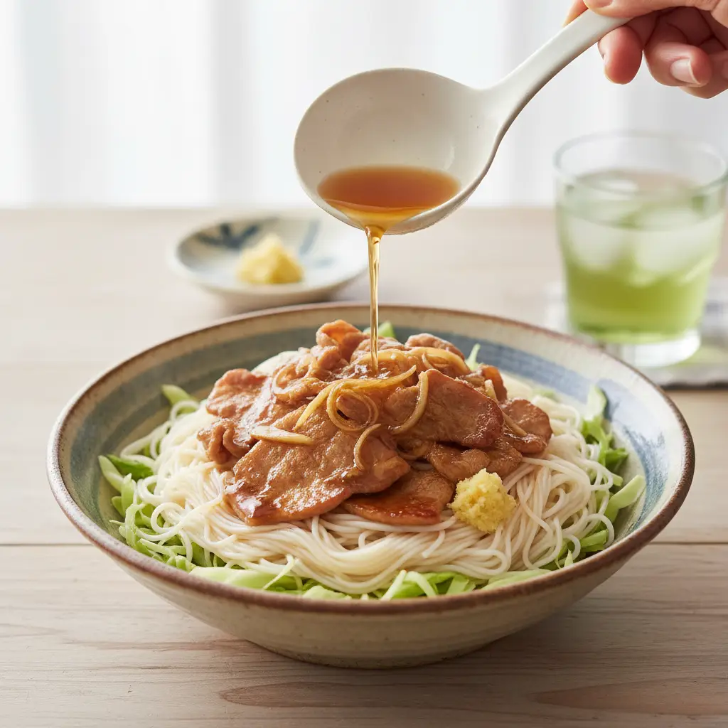 將高麗菜絲和素麵盛入碗中,放上豬肉、薑泥,最後淋上麵露。